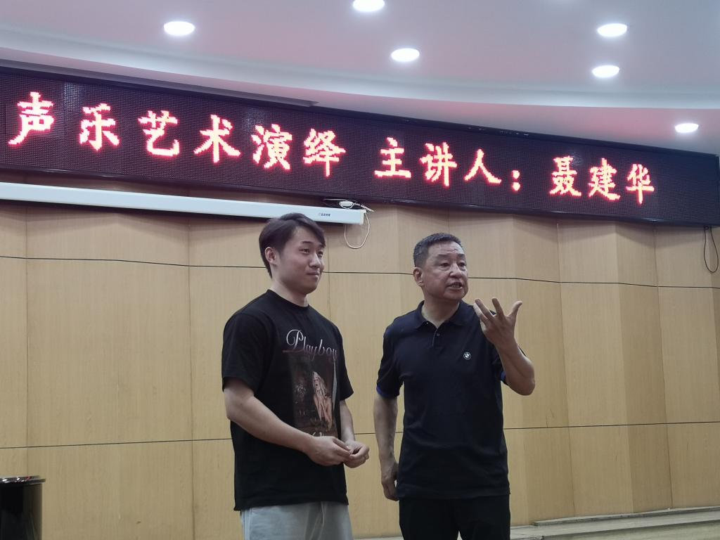 讲座中,聂建华老师首先向同学们分享了自己的声乐学习历程、职业生涯中的感悟,讲述了声乐学习的一些重要方法与演唱经验。聂建华老师说:“学会控制,正确使用气息,这是歌唱中极其重要,但却经常被忽视的一个环节。同学们应该花大量的时间去练习如何控制气息,并在平时训练时要尽可能演唱足够长的乐句,这样有助于在歌唱时很自如的使用气息。”聂老师还说道:“演唱歌曲要严格按照谱面要求进行,这样才能唱好每一首歌,演好每一场歌剧。”