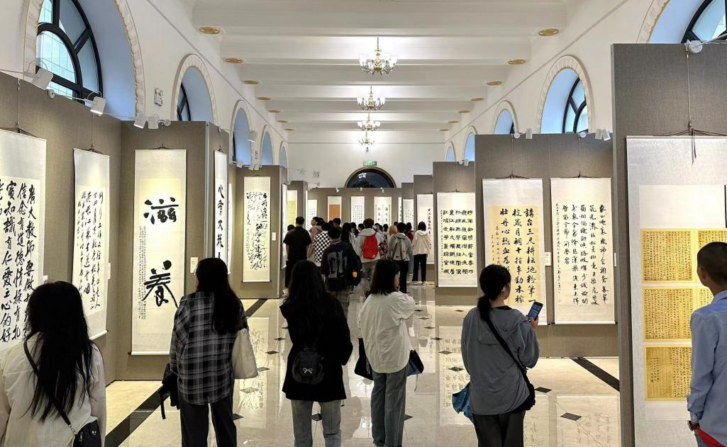 教师节当天,虽然天空下着绵绵秋雨,气温骤降,但参观师生的参观热情不减。同学们面对一幅幅优秀的书画作品连连发出惊叹,并在老师的指导下,结合自己的专业知识对作品的创作技法、艺术表现以及寓意思想进行交流。