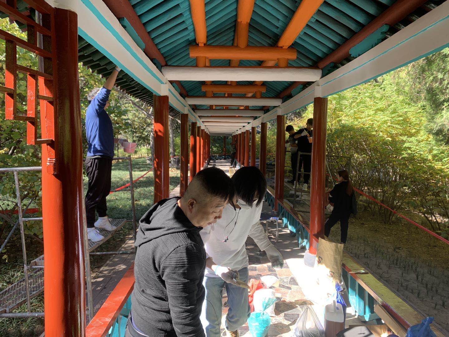 10月31日下午,杨正民处长与夏瑞丽书记分别带领相关负责同志及部分学生代表步行来到柏林园入口处共同参观长廊彩绘工作完成情况并进行了简短的剪彩仪式,此次长廊翻新工作由后勤管理处校园绿化中心具体负责,先后对廊体进行维修、加固、廊顶古砖修补及枯枝树叶的清理,并将长廊彩绘工作由厂长资源
