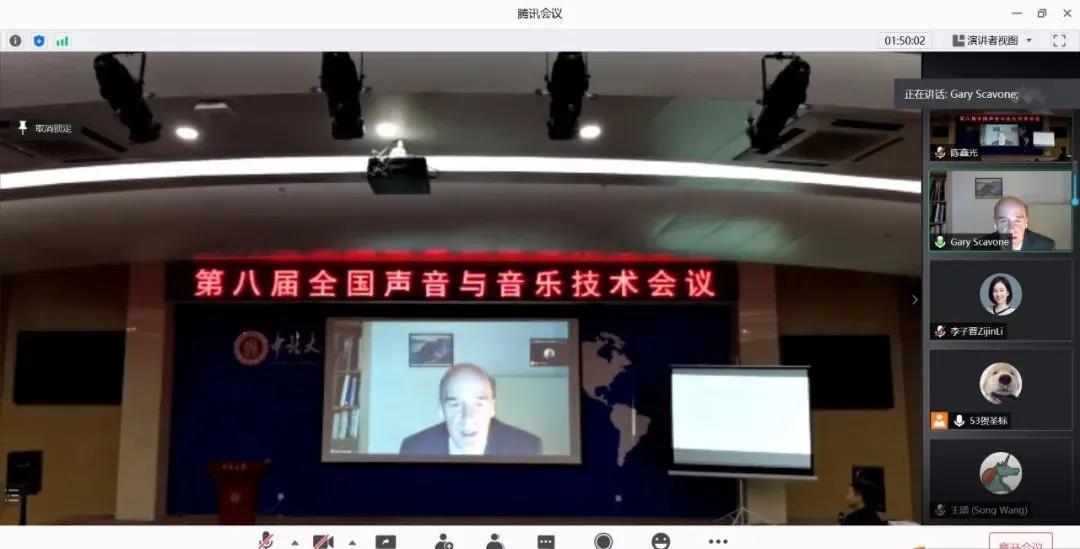 本次会议开辟了网络互动演讲的先例,在中国音乐学院李子晋老师的协调帮助下,我们请到了麦吉尔大学舒立克音乐学院音乐技术教授,计算声学建模实验室主任,麦吉尔大学音乐科技专业方向主席,音乐媒体与技术跨学科研究中心(CIRMMT)“乐器、设备与系统”研究方向联合领导者Gary Scavone在网络上为我们进行了题为《Musical Acoustics Research》的视频演讲。这是CSMT会议第一次请国外学者直接给会议作报告。