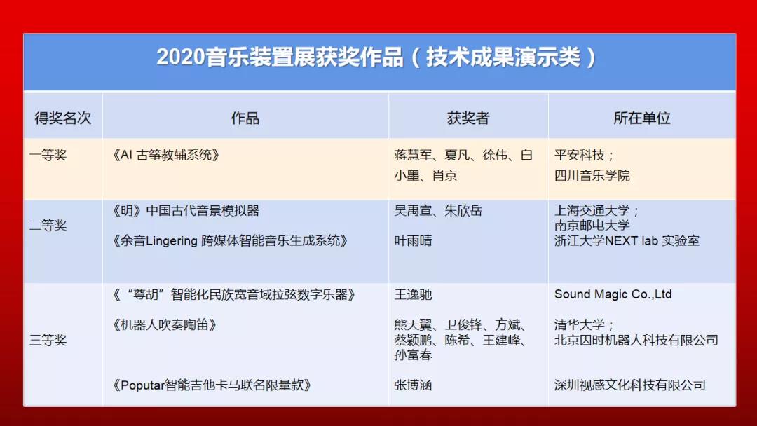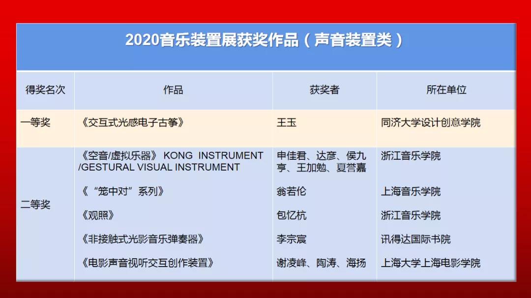 声音与音乐装置展是第八届全国声音与音乐技术会议的重要活动之一,也是首次进入CSMT的活动。其宗旨是为研究人员与艺术家提供平台,鼓励科技与艺术的跨界融合,并强调音乐技术在应用中的有效性。本次声音装置与技术成果展共收到来自28家单位的参展作品34件,其中技术成果12件,音乐装置11件,交互音乐作品11件。三个组别获奖作品共计18件。