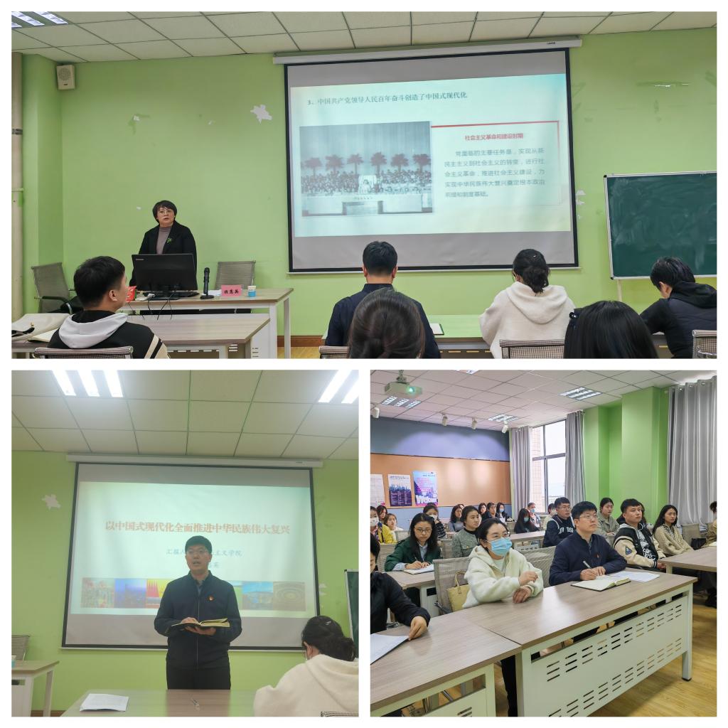 党委邀请学校党的二十大精神宣讲团成员、马克思主义学院教师班惠英以《以中国式现代化推进中华民族伟大复兴》为题,为学院师生党员作了专题辅导。宣讲会由学院党委副书记田维飞主持。