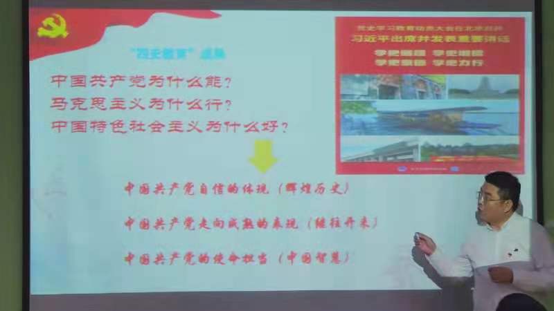 杜刚老师以“四史教育”取得的成果为切入点,从中国共产党为什么能?马克思主义为什么行?中国特色社会主义为什么好?三个方面为大家做了详细阐述,并通过一个个详实的事例展示了我们国家从站起来到富起来再到强起来的巨大变化。之后,着重解读了“中国共产党的文化基因”和“中国共产党文化软实力建设”两个方面的内容。中国共产党的五大文化基因,即“大道之行也,天下为公”的家国情怀、“士不可以不弘毅,任重而道远”的理想信念、“天行健,君子以自强不息”的奋斗精神、“民惟邦本,本固邦宁”的人民立场、“子帅以正,孰敢不正”的自我革命。随后,在中国共产党的文化软实力建设中,杜老师为大家讲解了中国共产党文化软实力的定义、渊源,并着重强调了中国共产党文化软实力的五大内涵:文化基础力、文化凝聚力、文化传承力、文化传播力、文化创造力。杜老师强调,过去一百年,中国共产党向人民、向历史交出了一份优异的答卷,现在,中国共产党团结带领中国人民又踏上了实现第二个百年奋斗目标新的赶考之路。新时代,我们要以实现中华民族伟大复兴为己任,增强做中国人的志气、骨气、底气,不负时代,不负韶华,成为实现中华民族伟大复兴的先锋力量。