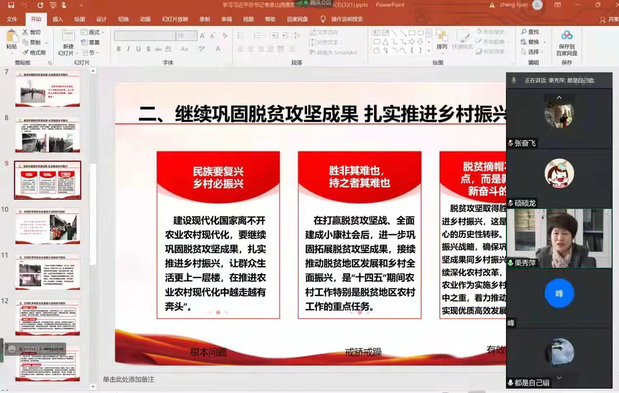 栗秀萍书记从“始终把人民群众安危冷暖放在心上、继续巩固脱贫攻坚成果扎实推进乡村振兴、扛好扛牢历史文化资源大省的时代使命、狠抓安全生产 坚决维护社会大局稳定、始终绷紧疫情防控这根弦、纵深推进能源革命 保障国家能源安全、为实现碳达峰碳中和目标贡献山西力量”六个方面深入浅出地解读了习近平总书记视察山西重要讲话的重要指示。感受党中央对山西工作的高度关注,感悟党的创新理论的真理力量和实践力量。