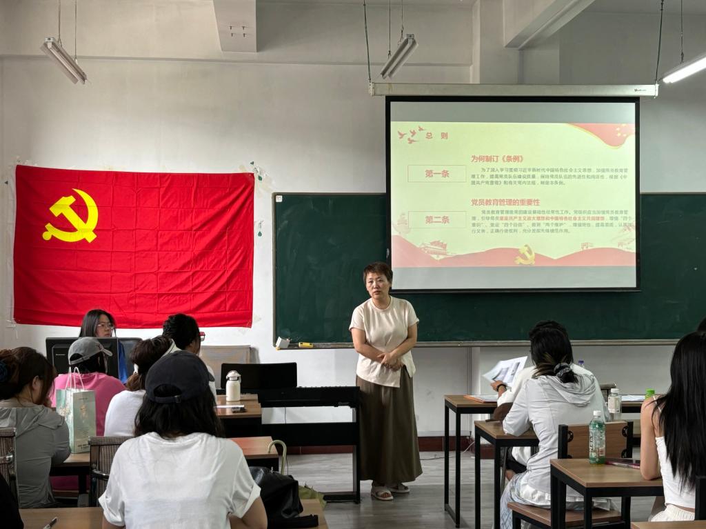 其次就“学习贯彻习近平新时代中国特色社会主义思想、党员教育、党员管理”等方面进行了讲授。支部书记夏志丽强调学生党员要充分认识学习《中国共产党党员教育管理工作条例》的重大意义,切实增强学习贯彻的自觉性和坚定性。强调要以《条例》规范党支部成员的工作,把铁的纪律转化为日常习惯和自觉遵守。正逢毕业季,她提醒毕业生党员要做好党组织关系转接工作,确保高效完成组织关系转接事宜。同时,党支部的后备成员要时刻发挥一个共产党员的先进模范作用,清正廉洁、率先垂范,站好岗、履好职、担起责,以忠诚干净担当的优良作风,为党支部的建设发展提供坚实的纪律保障。