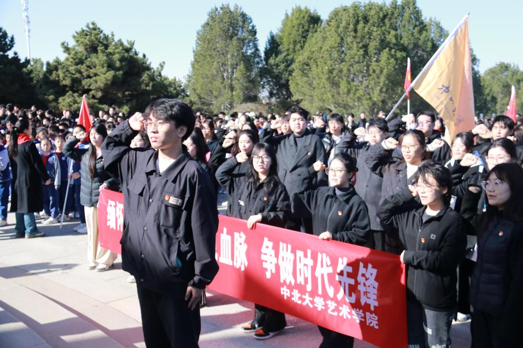 活动第四项,在学生党员代表郭晋波同志的领誓下,全体党员面向党旗,高举右拳,重温入党誓词。铮铮誓言,字字千钧,回荡在烈士陵园上空。这不仅是对入党初心的回顾,更是对未来的郑重承诺。随后,全体党员手持鲜花,有序前往烈士墓碑前。大家用纸巾轻轻擦拭墓碑上的尘埃,献上鲜花并鞠躬致敬,以最朴素的方式表达对英烈的无限追思。在活动过程中,两名学生党员接受了媒体采访。其中学生党员郭晋波感慨地说:“作为一名源自革命烽火、熔铸红色基因的中北学子,每逢置身此类场所,先烈们为理想勇于献身的革命精神无不令我感慨万千,此情此景,常激励我作为一名学生党员,务必勤学专业知识,以期在未来职场中发挥先锋模范作用。与此同时,我也已报名参与西部计划,立志在祖国最需要的地方奉献我的青春与力量。”