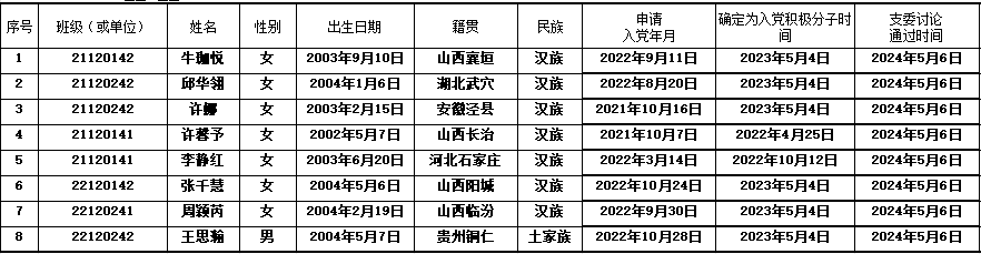 经党支部培养教育和考察,在听取党小组、培养人、党员和群众意见,积极分子量化考核的基础上,经支委会2024年5月6日讨论,拟确定牛珈悦等8名同志为发展对象。