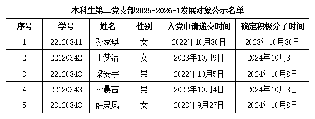 经党支部培养教育和考察,在听取党小组、培养人、党员和群众意见,积极分子量化考核的基础上,经支委会2025年10月22日讨论,支部拟确定孙家琪等5名同志为发展对象。