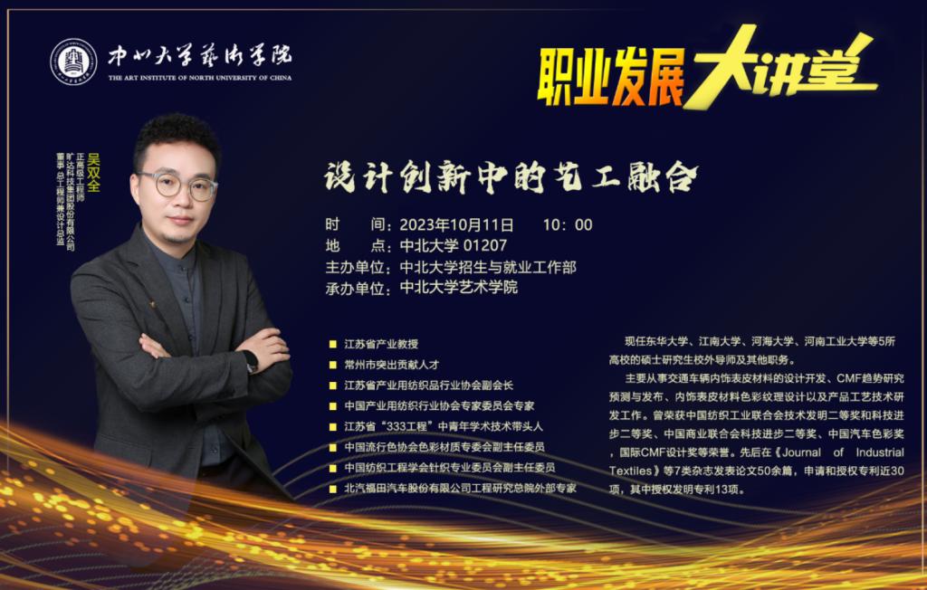 在09526教室举办了题为《设计创新中的艺工融合》专题讲座。本次讲座特邀常州旷达科技集团股份有限公司董事、总工程师兼设计总监吴双全为21级文创设计方向学生作了专题讲座。常州旷达控股集团有限公司董事长兼党总支书记沈介良,厂长资源
