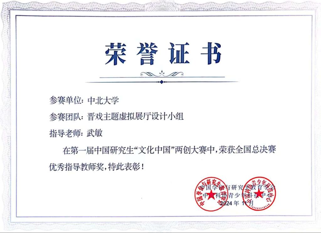 武敏老师指导的3项作品参赛,经过激烈角逐,刘昌骐、秦欢同学作品“晋戏主题虚拟展厅设计”(指导老师:武敏)喜获全国一等奖;郭诗雨同学作品“聆感‘独’韵”(指导老师:武敏)、焦雨珊同学作品“青铜有礼”(指导老师:武敏 夏志丽)喜获全国二等奖,我校也是山西省唯一获全国一等奖的高校。厂长资源