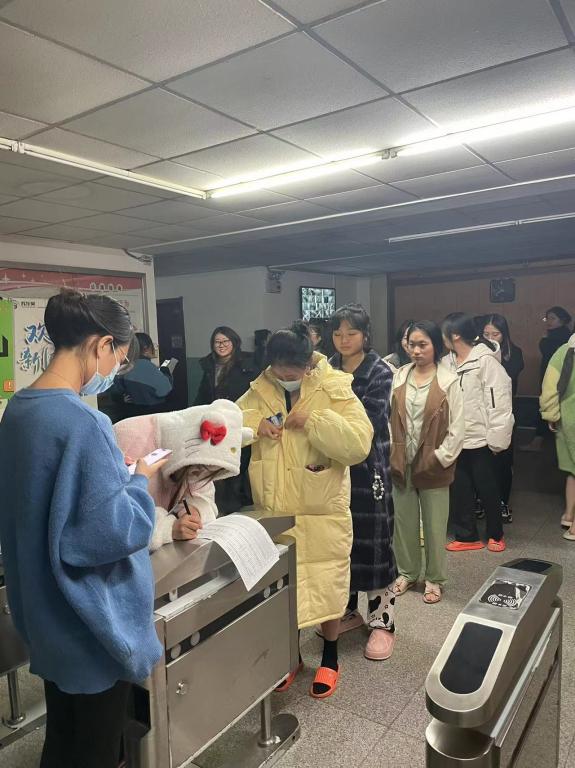 为了规范学生日常作息,保护学生人身安全,督促学生养成按时就寝的习惯。11月30日晚上10:40,院党委副书记田维飞带领学院全体辅导员、班主任老师开展了夜不归宿专项检查。 本次专项检查,主要采取学生本人到各自公寓门口签到和老师们进行宿舍复查的形式进行,从而确保“夜不归宿”数据的真实有效性。现场同学们有序排队签到,并且由专门的负责人时刻检查签并逐一核对。