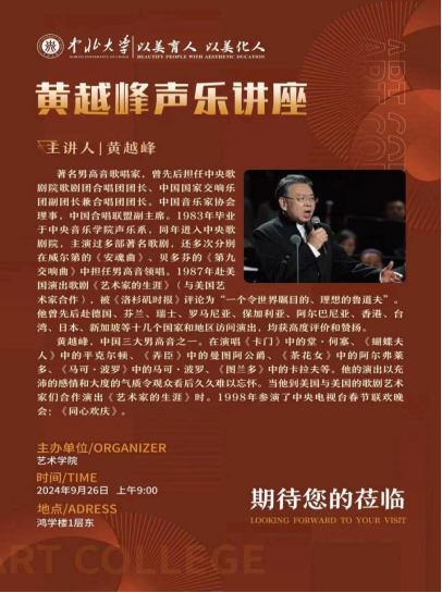 黄越峰教授以其卓越的艺术造诣和无私的奉献精神,为师生们呈现了一场精彩绝伦的声乐表演与教学示范。他通过生动的讲解与示范,让师生们深刻感受到了声乐艺术的独特魅力与无限可能,进一步激发了大家对音乐艺术的热爱与追求。