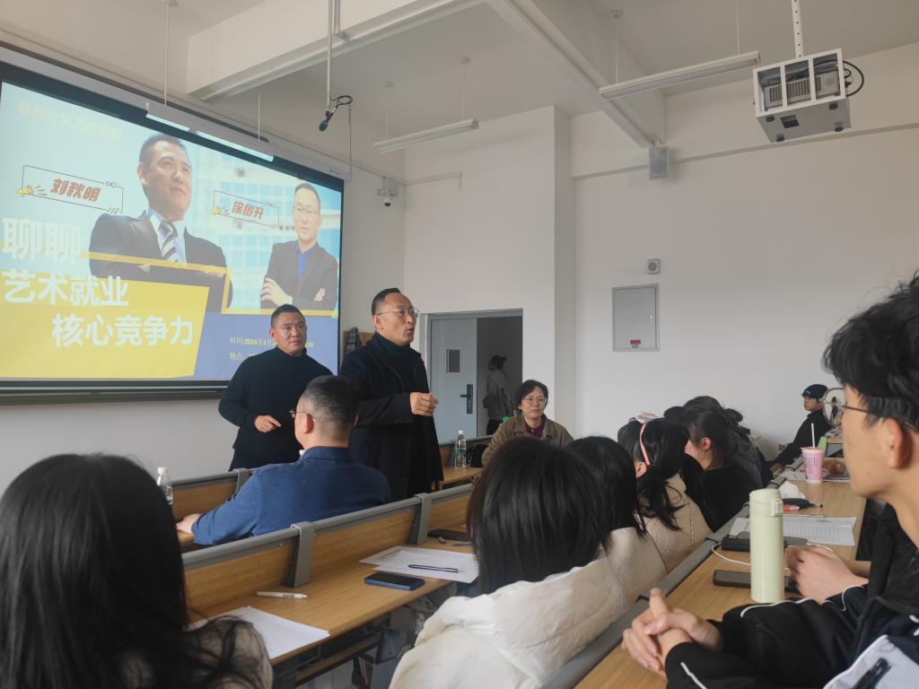 最后校友刘秋明、徐树升与同学们进行了互动,针对同学们提出的问题答疑解惑。在交流过程中刘董提出艺术专业要对AI创造多了解多学习。徐董在解答过程中提到“艺术就是价值”,作为学生在大学阶段要将专业学好,让艺术绽放光芒、创造最高价值,只有自己有价值、更好地为公司创造价值就是在提高自身的竞争力。