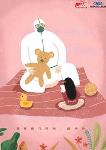 本作品以愿春暖花开时,陪伴你/守护你/相随你为主题标语,以孩子,老人,爱人为主体,展现医护人员的柔性的一面,也体现出抵抗病毒的决心,同时也表明了战疫的主题思想,愿春暖花开时,有你。