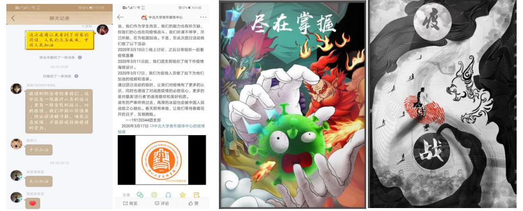 微博和QQ等各大官方平台进行发布宣传,为抗‘疫’尽绵薄之力。大家尽己所能,怀着对‘逆行者’们的祝福,各自写下了对前线的祝福语,发挥专业优势,设计了多幅关于疫情的宣传海报。